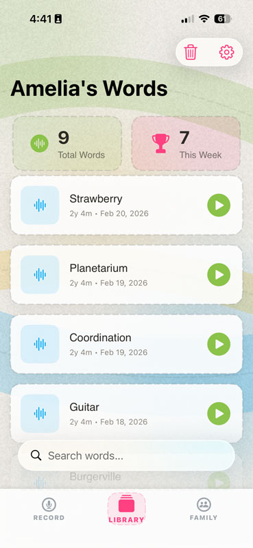 The app celebrates every 5, 10, 25, 50, 75, and 100 words recorded — because every word is worth celebrating.